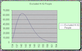 By dividing the distribution function of the elite professions' IQ by that of the general population, we can calculate the relative probability that a person of any given IQ will enter and remain in an intellectually elite profession. We find that the probability increases to about 133 and then begins to fall. By 140 it has fallen by about 1/3 and by 150 it has fallen by about 97%. In other words, for some reason, the 140s are really tough on one's prospects for joining an intellectually elite profession. It seems that people with IQs over 140 are being systematically, and likely inappropriately, excluded. With the conservative assumption that, absent the exclusionary processes, IQs above 133 neither help nor hinder the achievement of elite profession membership, the excluded population is distributed as shown above. If we assume that the positive correlation seen below 133 IQ continues above 133, the excluded population would be larger and the exclusion more complete.